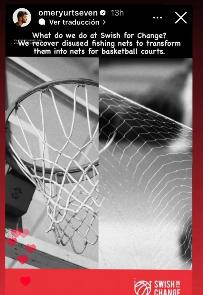 La solució arriba connectant la voluntat de l’Ömer de promoure la sostenibilitat amb el nostre objectiu d’impactar positivament en la contaminació marina. Així va néixer el concepte: Swish for Change. Swish, pel so de la pilota entrant a la cistella, i Change, perquè amb aquesta iniciativa cada encistellada és un punt a favor de la sostenibilitat. Ho vam aconseguir transformant xarxes de pesca en desús en xarxes de bàsquet.